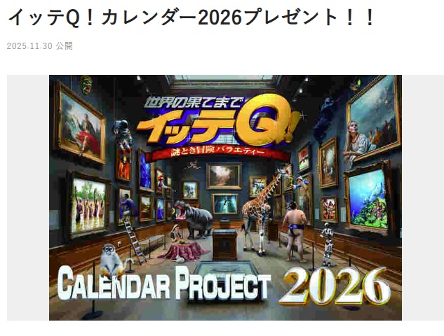 日本テレビのバラエティ番組『世界の果てまでイッテQ!』から、今年も2026年カレンダーの発売決定記念キャンペーン開催♪ 今回は2026年用のスペシャルなカレンダー(壁掛... -