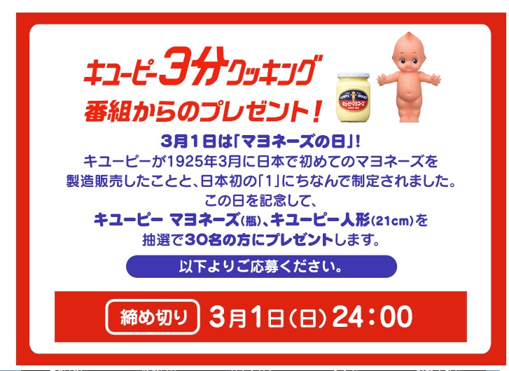 CBCテレビで毎週月曜から金曜11:20から、土曜11:30から放送の「キユーピー3分クッキング」から視聴者プレゼントキャンペーン開催♪ 今回はマヨネーズの日記念としてキユ... -