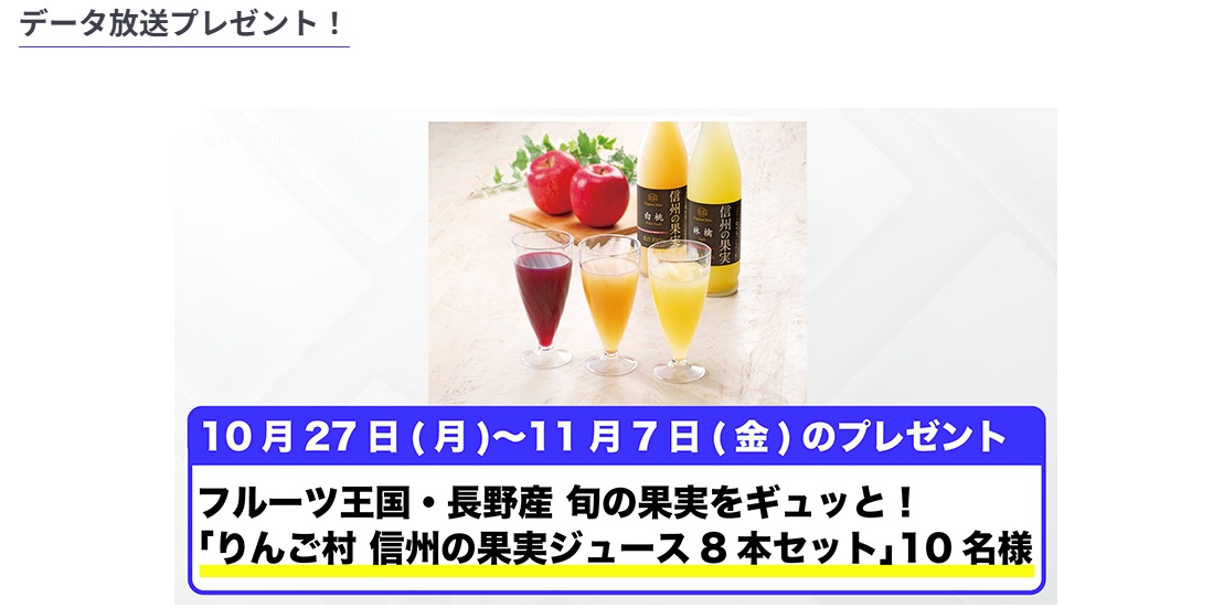 データ放送参加の応募で今週は「りんご村 信州の果実ジュース8本セット」を10名様にプレゼント♪
